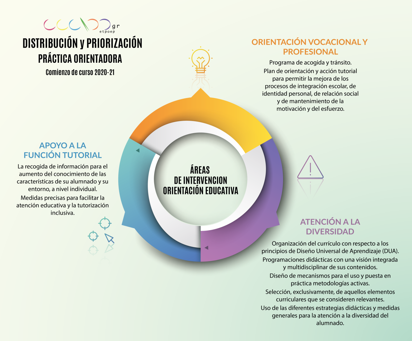 De manera que esta nueva realidad hace necesaria una priorización de las tareas de los profesionales de la orientación facilitando la dedicación a áreas de intervención que estaban relegadas por la inercia de la costumbre y los esquemas previos. Estamos ante la oportunidad de equilibrar todas las actuaciones dedicadas a nuestras ya históricas tres áreas de intervención: acción tutorial, orientación vocacional y atención a las necesidades educativas especiales.