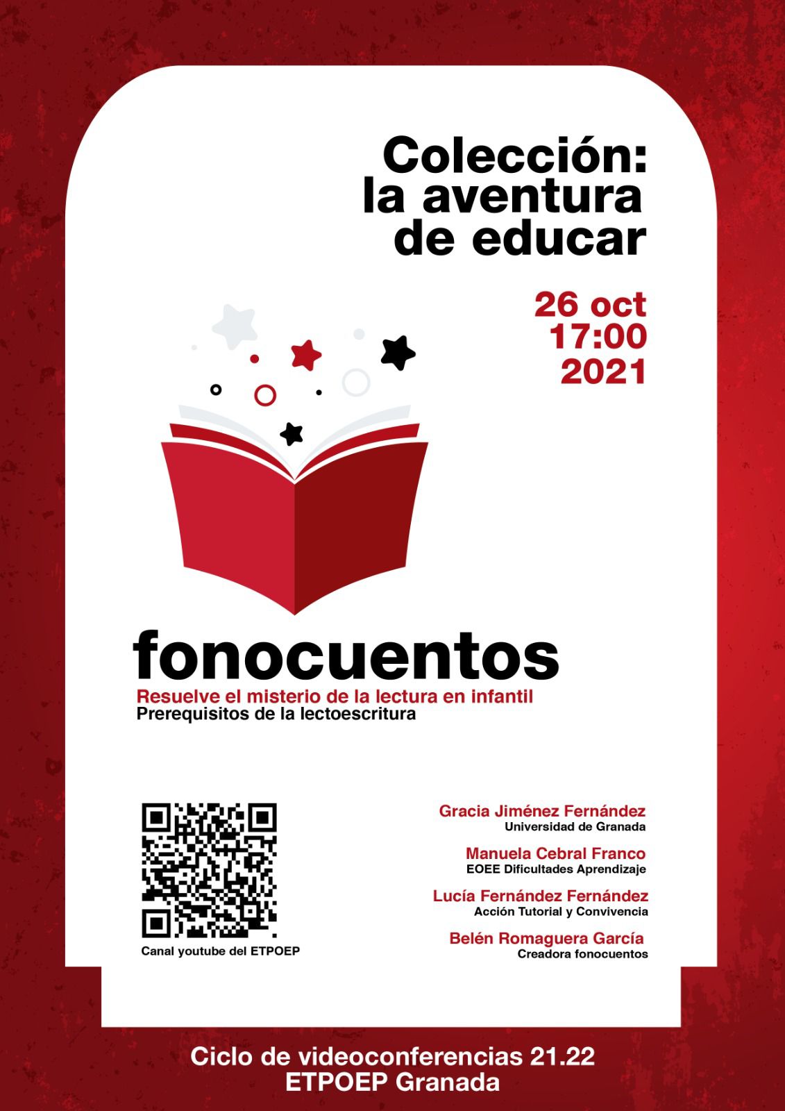 El martes 26 de octubre de 2021 a las 17:00h, inauguramos esta iniciativa con la retransmisión en directo de la primera videoconferencia titulada «Fonocuentos (®): resuelve el misterio de la lectura en infantil» donde tratamos cómo trabajar los prerequisitos de la lectoescritura en infantil y primer ciclo de primaria.