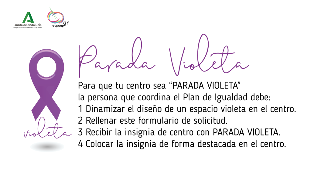 El ETPOEP de Granada contribuye a este día con “Violeta Free Tour”, una iniciativa que pretende un doble objetivo en los centros educativos. En primer lugar, que puedan visibilizar, mostrar y exponer a la comunidad educativa el trabajo que desarrollan relacionado con la igualdad y la prevención de la violencia de género y en segundo lugar, que los centros puedan generar redes visitando a otros centros educativos para enriquecerse de sus experiencias, mediante la creación de rutas o itinerarios de visita.