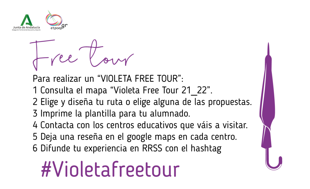 “Violeta Free Tour” se inspira en los famosos free tour turísticos que nos permiten visitar una ciudad o una localidad haciendo paradas en los lugares o monumentos más emblemáticos. En “Violeta Free Tour” las paradas serán en los centros educativos que deseen ser un centro con «Parada Violeta», generando así rutas coeducativas y libres de violencia por toda la provincia.