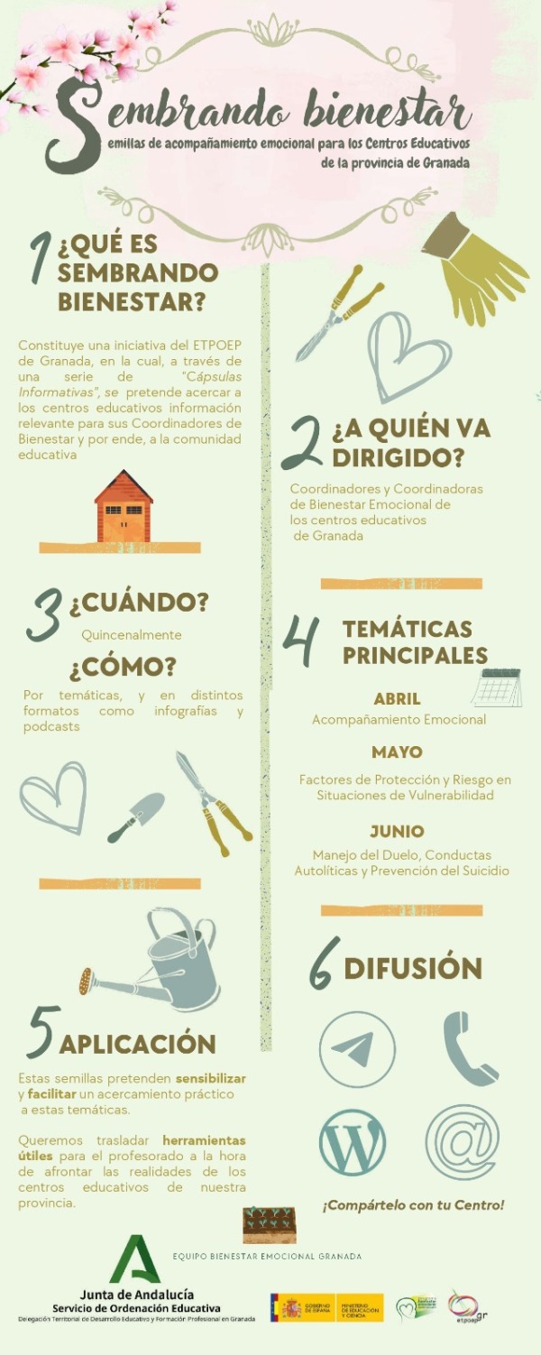 La Delegación Territorial de Desarrollo Educativo y Formación Profesional en Granada, a través del Equipo Técnico Provincial para la Orientación Educativa y Profesional de Granada y el Equipo de Bienestar Emocional, os presenta la iniciativa "Sembrando Bienestar", conformada por “cápsulas informativas” a las que hemos denominado “Semillas”. El objetivo es acercar a los centros educativos... Leer más →